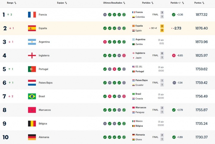 西班牙因此遭到法国反超,跌至世界第2位,排名欧洲区第2。